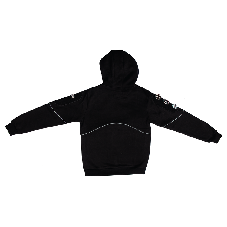 100% Cotton Hoodie with hook and loop panels on sleeves and left chest.