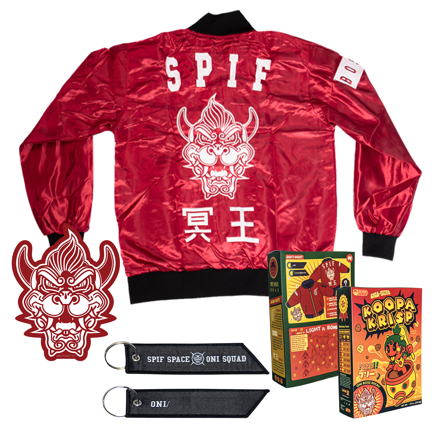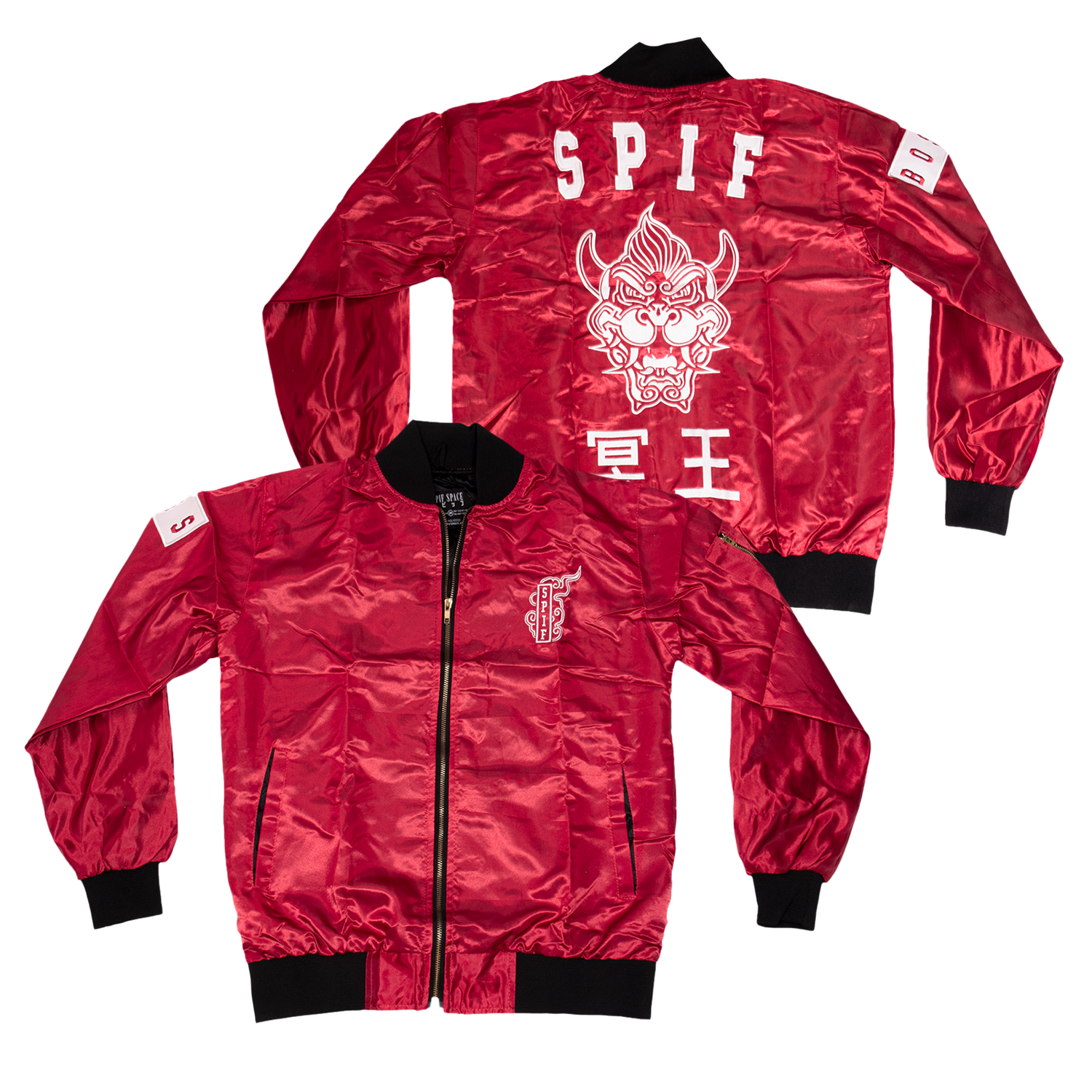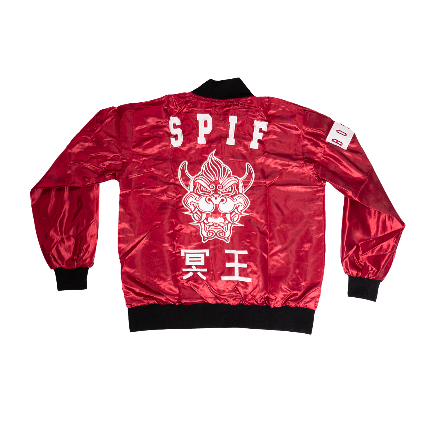 Jacket is constructed from a silky polyester with a black inner lining. Graphics and details are embroidered.